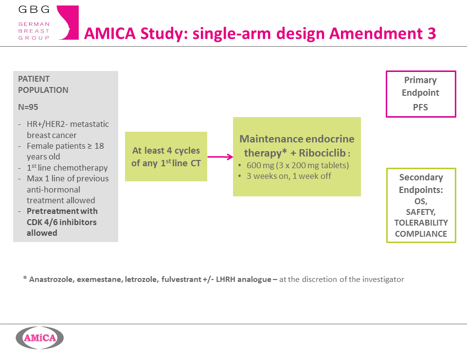 AMICA ist eine multizentrische, prospektive, offene Phase-II-Studie, die eine zusätzliche Gabe des CDK4/6 Inhibitors Ribociclib zu einer antihormonellen Erhaltungstherapie bei Patientinnen mit kontrolliertem, metastasiertem Brustkrebs (mindestens stabile Erkrankung) nach First-Line-Chemotherapie untersucht.