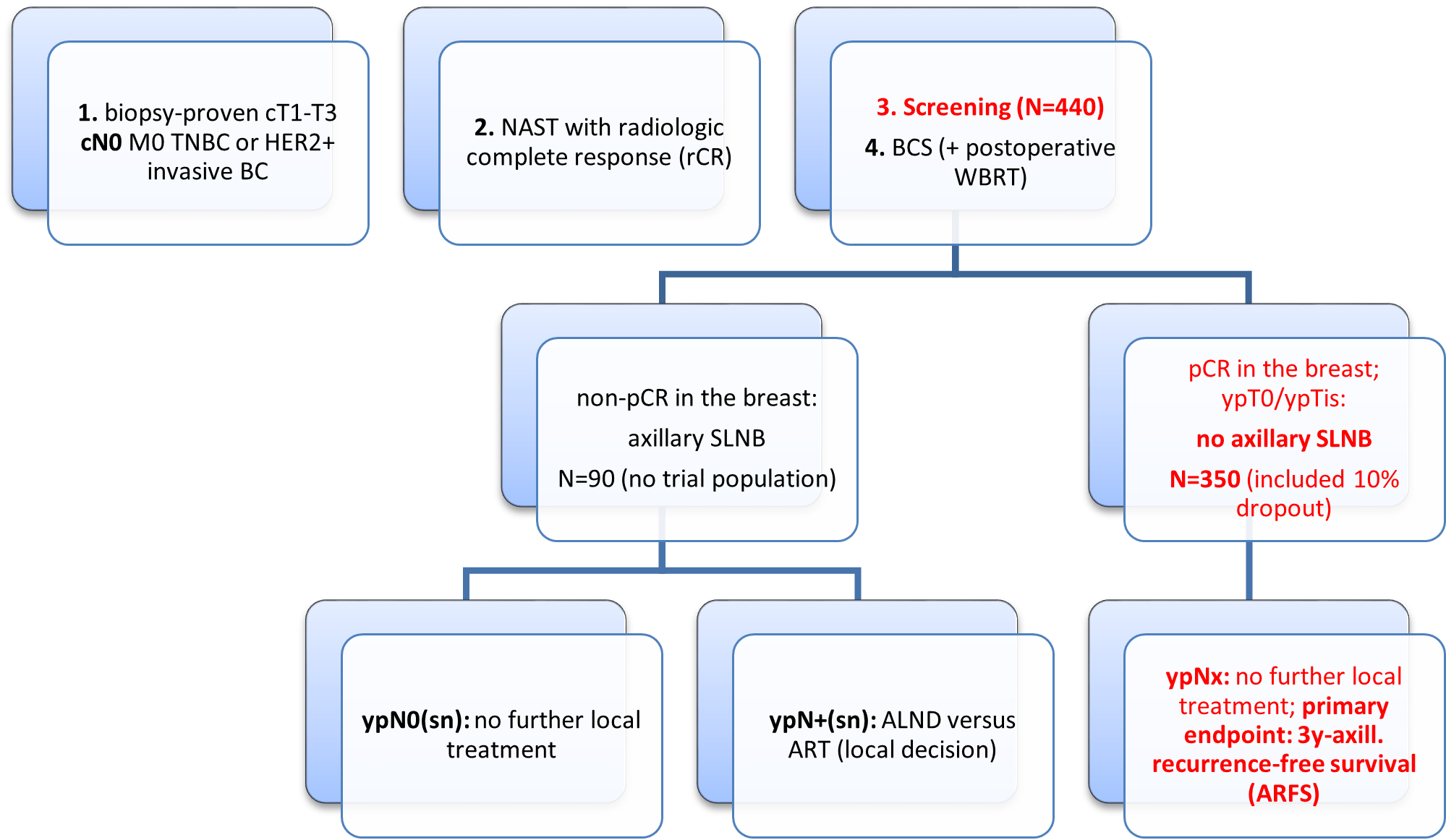 Improvements in systemic treatments for breast cancer have increased the rates of pathologic complete response (pCR) in patients receiving preoperative systemic therapy (PST), offering the opportunity to de-escalate, and perhaps eliminate, surgery in patients who have a pCR. We propose a clinical trial in which only patients with the highest likelihood of having a pCR after PST will be included and type of surgery will be defined according to the response to PST rather than on the classical T (for tumor size in the breast) and N (for axillary lymph node involvement) status at presentation. In the planned trial, axillary surgery will be eliminated completely (no axillary sentinel lymph node biopsy) for initially clinical node-negative patients with radiologic complete remission and a breast pCR as determined in the lumpectomy specimen.