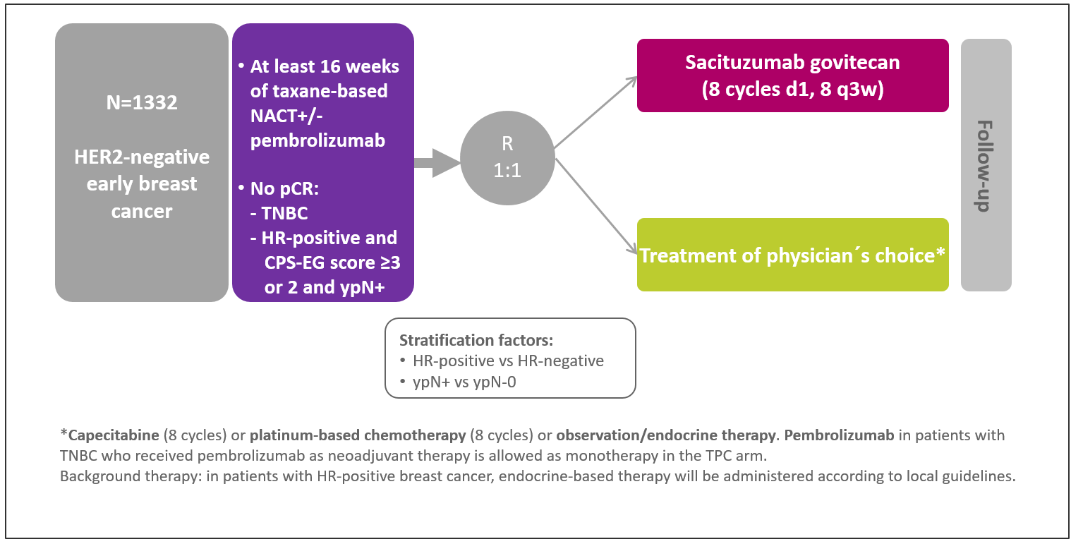 Dies ist eine prospektive, internationale, multizentrische, randomisierte, offene Phase-III-Parallelgruppenstudie in der die potenzielle inkrementelle Wirksamkeit und Sicherheit von Sacituzumab Govitecan in der Post-NACT-Umgebung bei HER2-negativen Patienten (TNBC oder HR-positiv) mit hohem Rückfallrisiko bewertet wird. Insgesamt werden 1322 Patienten in die Studie aufgenommen.
