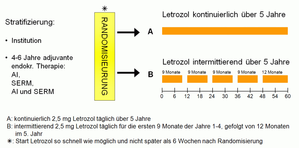 Patientinnen, die nach einer etwa 5-jährigen Behandlung mit Tamoxifen eine erweiterte Therapie mit Letrozol erhalten, haben hiervon im Vergleich zu Patientinnen, die nur eine Therapie mit Tamoxifen erhalten, einen zusätzlichen Nutzen. Ebenso wurden der Nutzen eines Wechsels auf einen AI nach einer 2- bis 3-jährigen Therapie mit Tamoxifen für eine insgesamt 5-jährige endokrine Therapie sowie der Nutzen einer 5-jährigen Therapie mit einem AI im Anschluss an die Operation nachgewiesen. Offen bleiben Fragen zur optimalen Dauer der Therapie und zum besten Behandlungsplan mit AIs in der erweiterten adjuvanten Behandlung. Diese Studie testet die Hypothese, dass IBCSG 35-07/BIG 1-07 Studie zur erweiterten Therapie mit Letrozol (SOLE) 2 V1.2 06Jul07 behandlungsfreie Intervalle von drei Monaten im Verlaufe der fünfjährigen erweiterten adjuvanten Therapie mit Letrozol das krankheitsfreie Überleben verbessern werden. Diese Hypothese basiert auf dem theoretischen Prinzip, dass der dreimonatige Entzug von Letrozol eine gewisse östrogene Stimulation ermöglicht, wodurch die verbliebenen resistenten Tumorzellen für die Fortsetzung der Therapie mit Letrozol empfänglich werden.