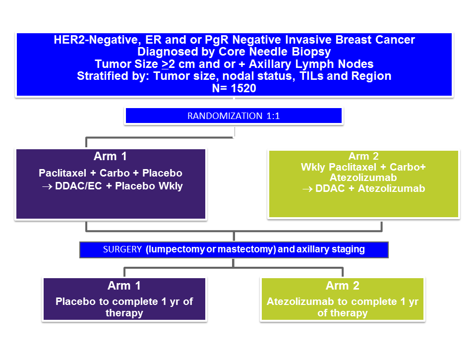 Diese klinische Studie zur neoadjuvanten und adjuvanten Anwendung von Atezolizumab/Placebo bei Patienten mit triple- negativem Brustkrebs und hohem Risiko untersucht die mögliche bessere Wirksamkeit sowie die Sicherheit durch Hinzugabe von Atezolizumab/Placebo zu einer neoadjuvanten Chemotherapie mit Paclitaxel weekly in Kombination mit Carboplatin alle 3 Wochen gefolgt von Atezolizumab/Placebo in Kombination mit AC/EC.